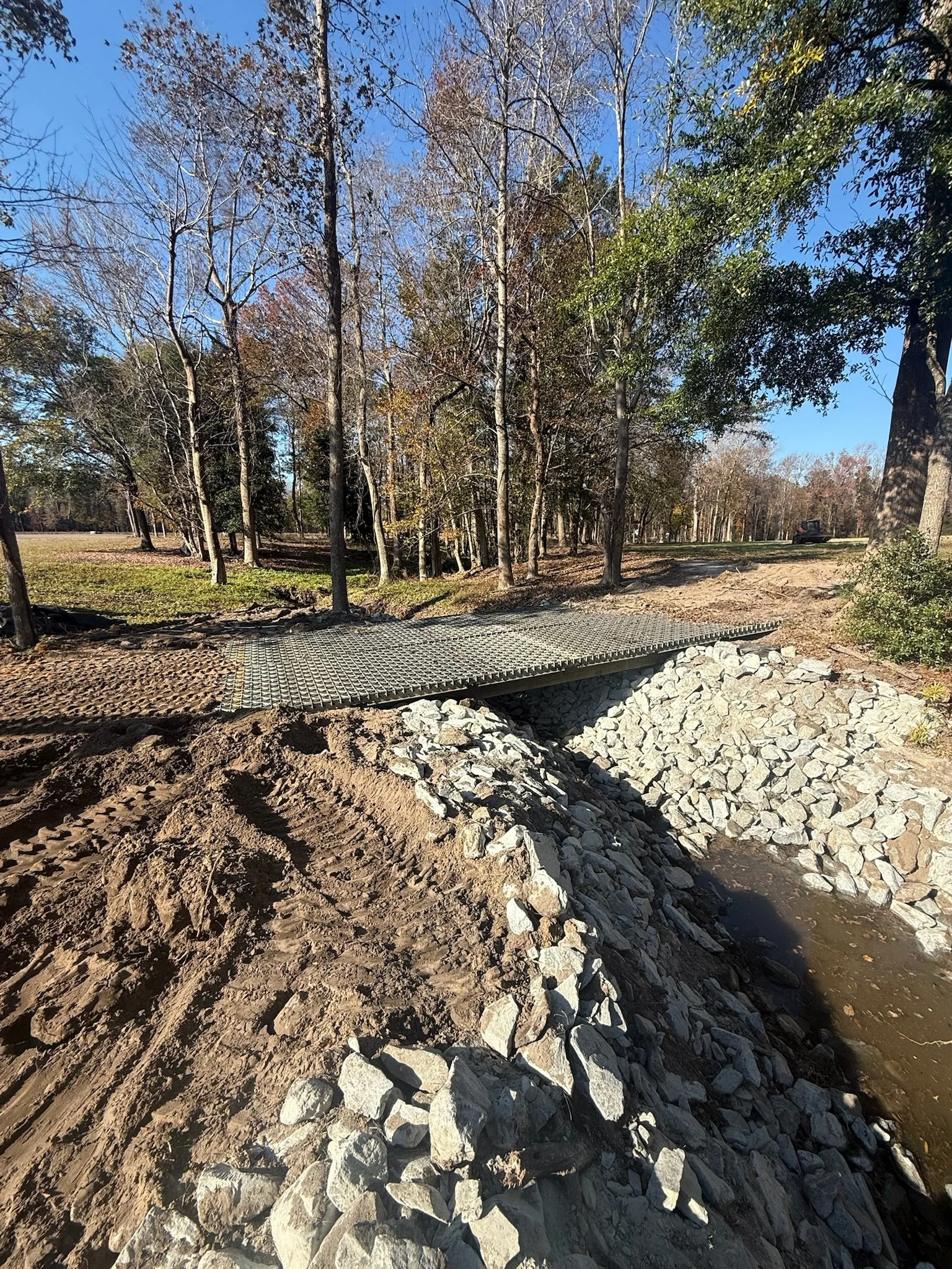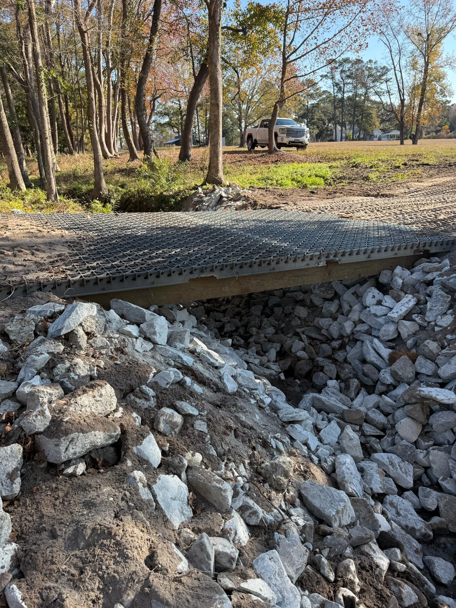 Construction site with a gravel road and metal grating over rocks, surrounded by trees and a parked truck in the background.