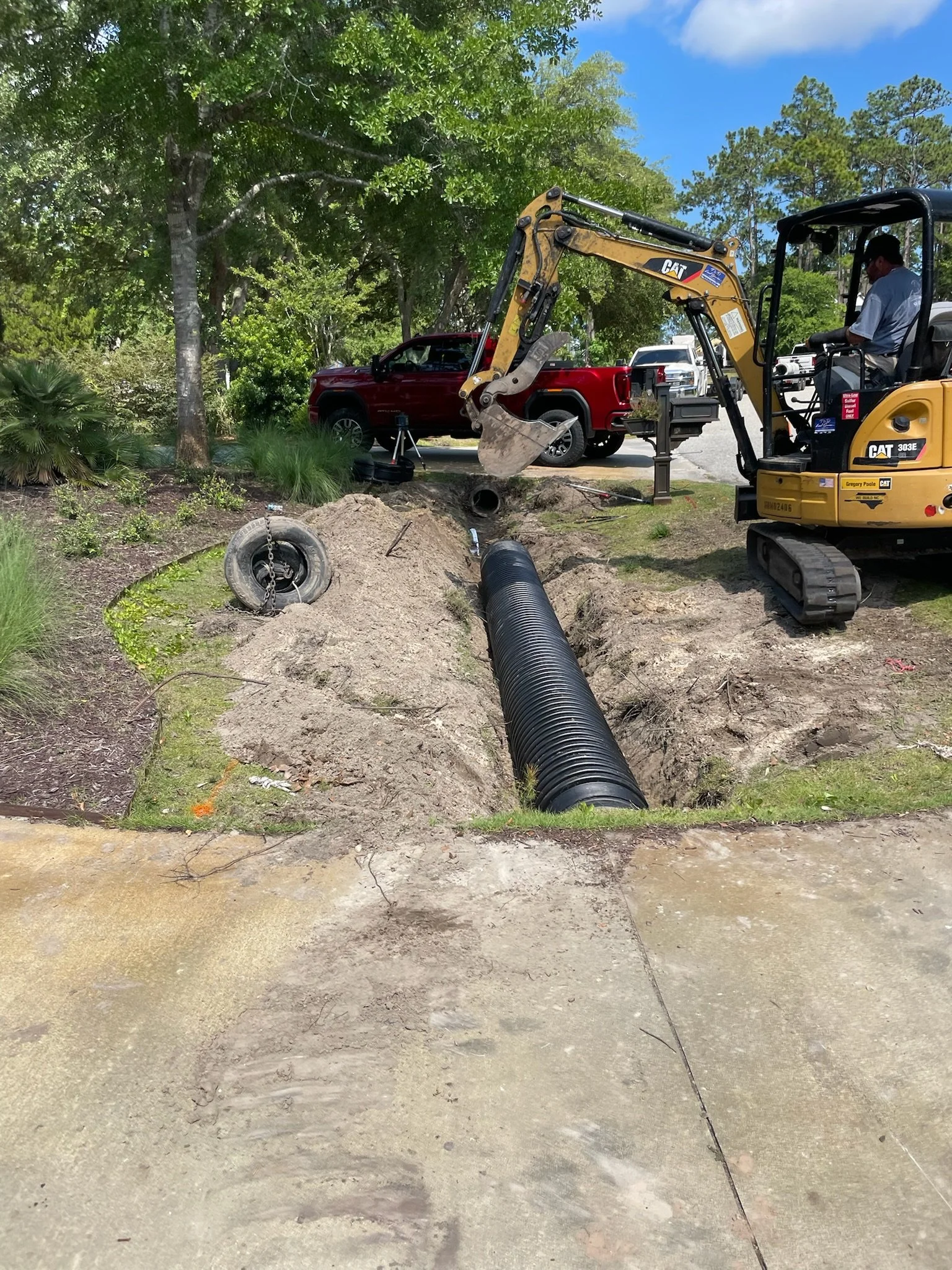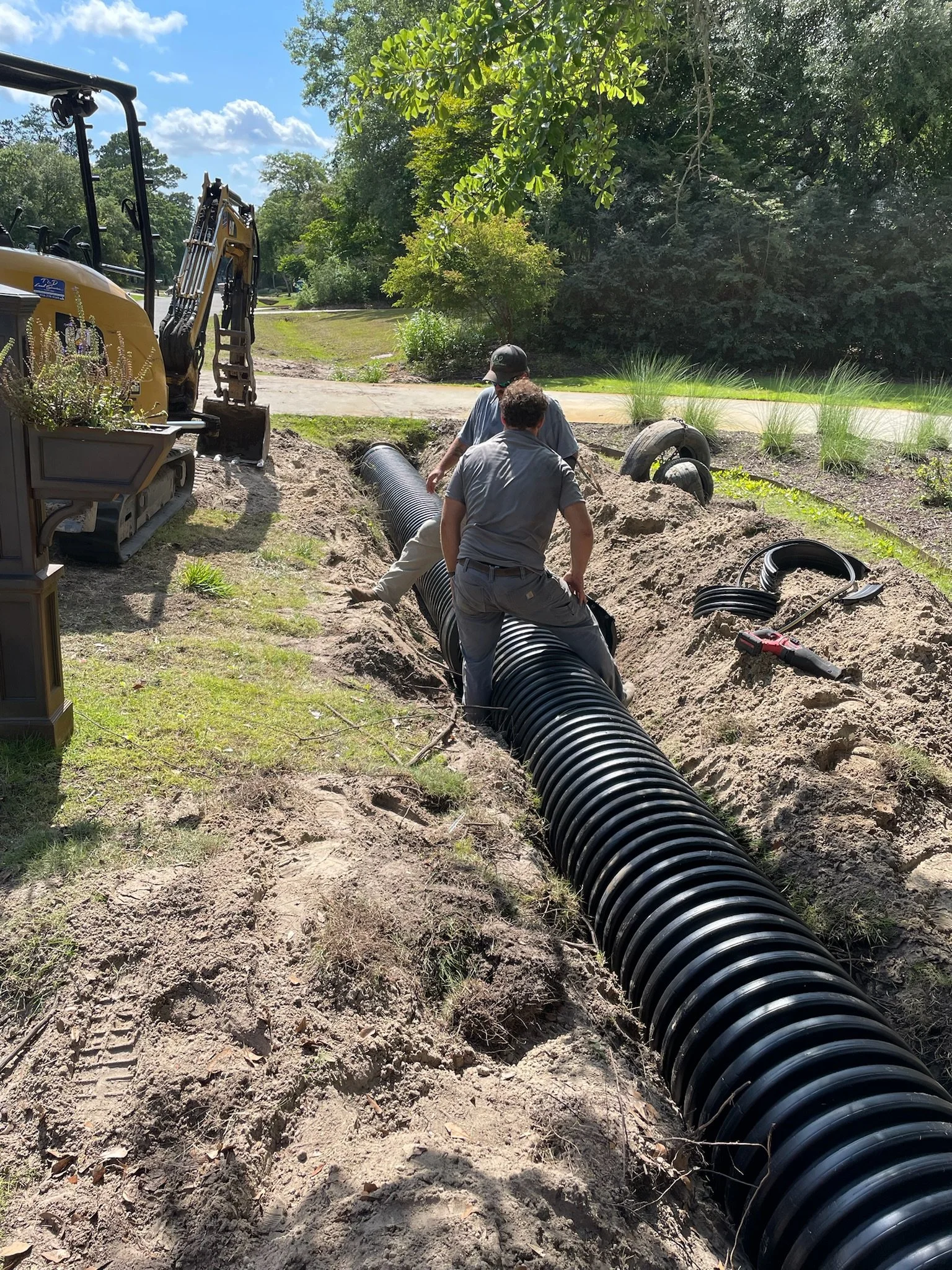 Construction workers installing large black corrugated pipe in trench with excavator nearby
