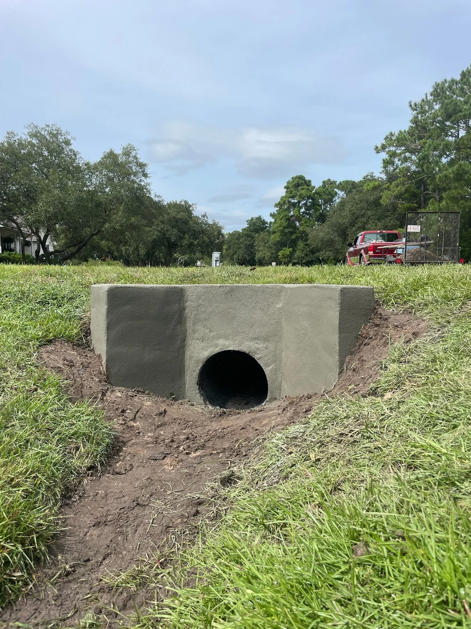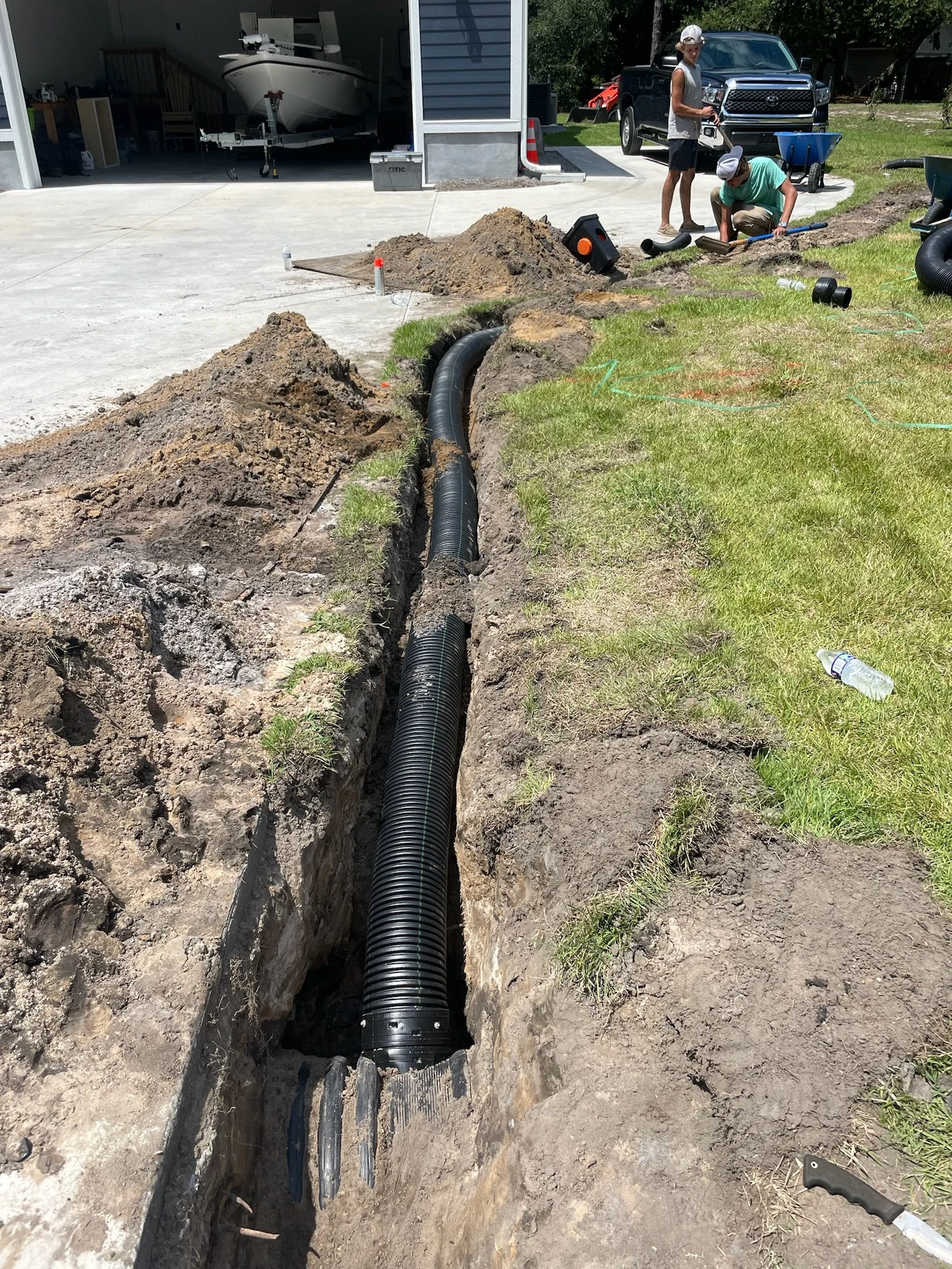 Trench with black drainage pipe being installed, two people working nearby, garage with a boat in the background, and a black truck parked outside.