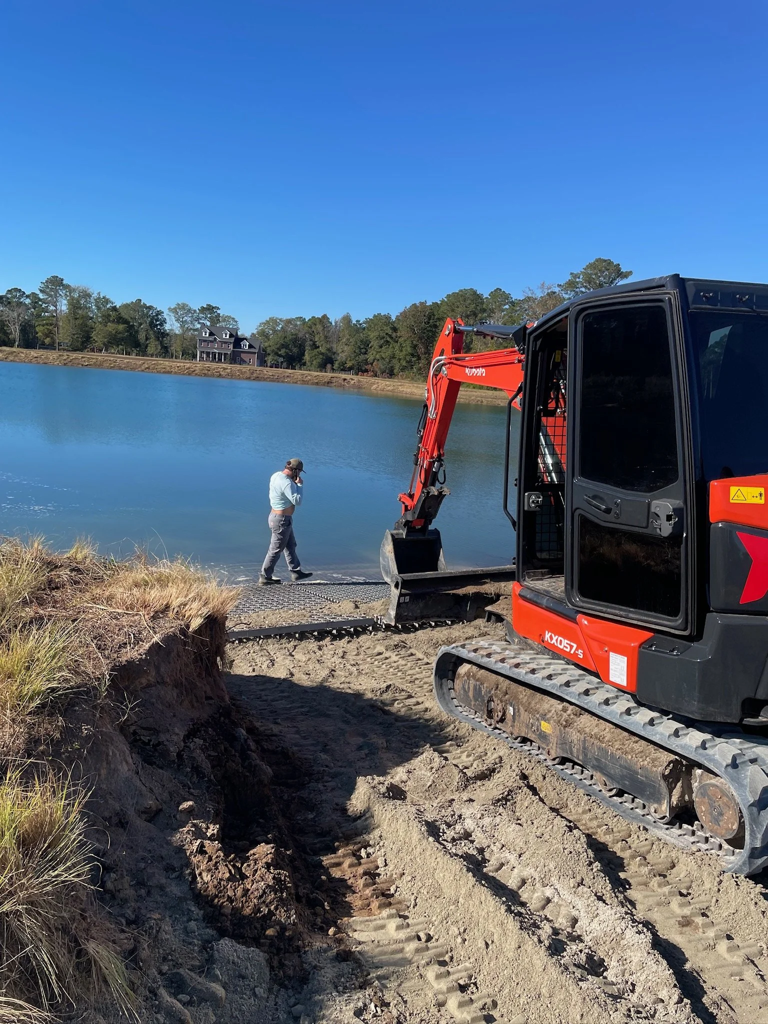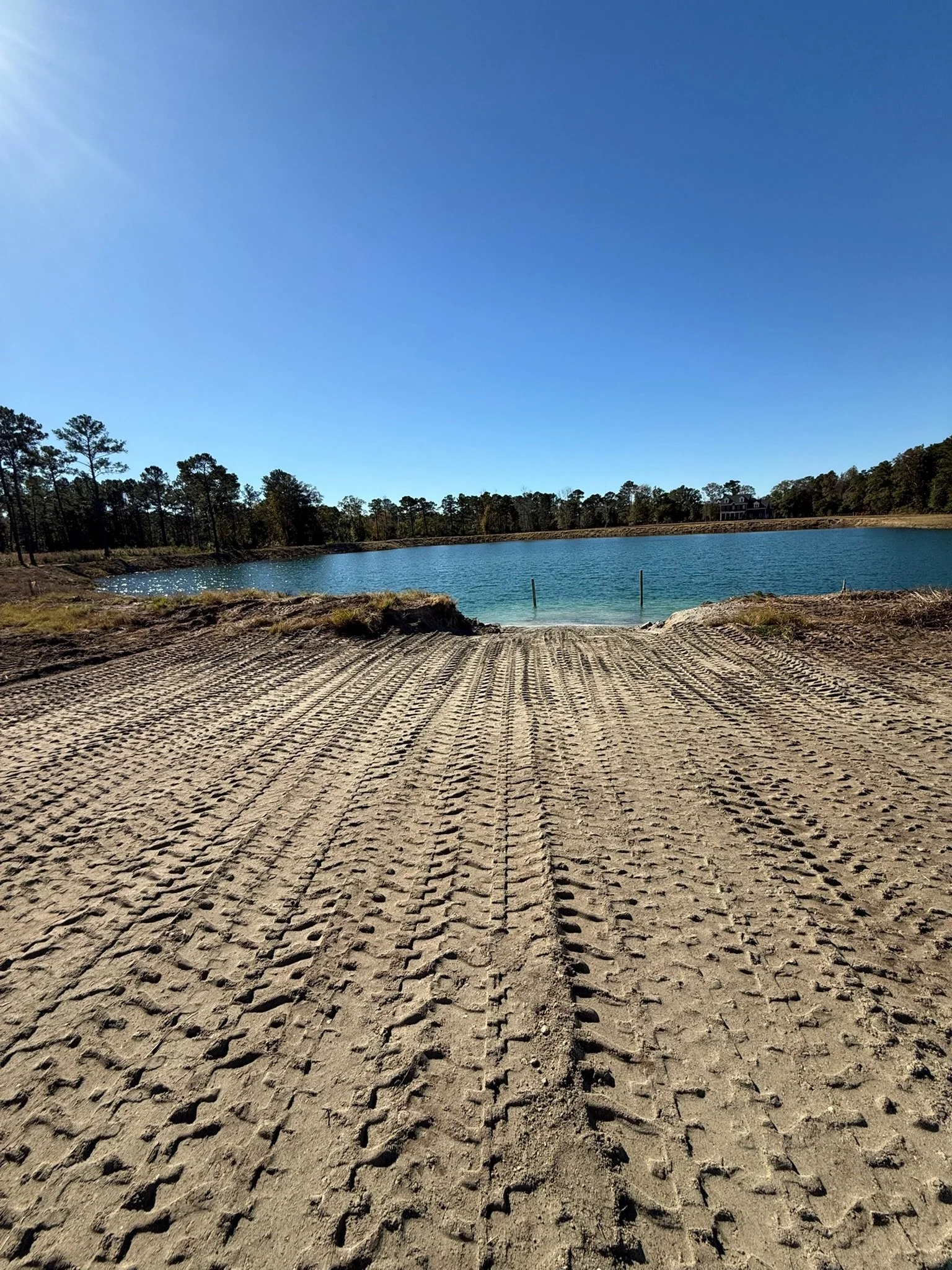 Dirt road leading to a small lake or pond, surrounded by trees, under clear blue sky.
